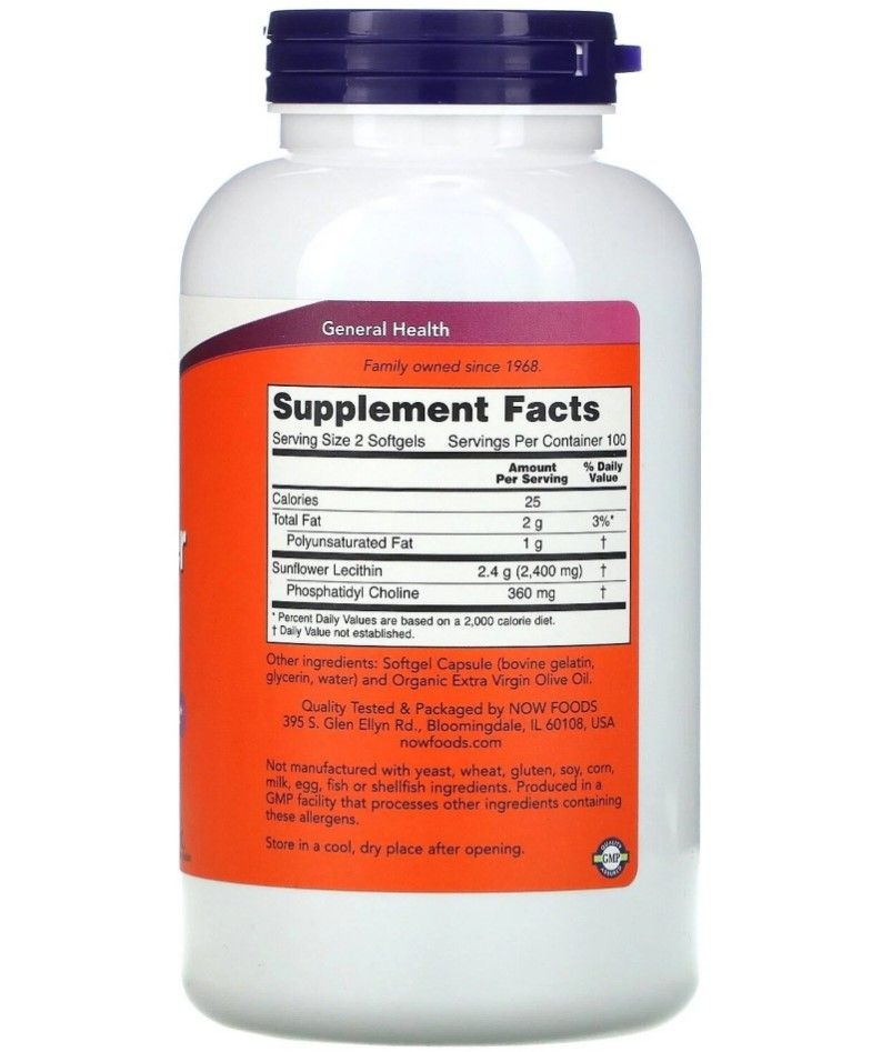 NOW Sunflower Lecithin 1200 mg 200 softgels — это высококачественная пищевая добавка, содержащая натуральный лецитин, извлеченный из подсолнечника. Лецитин является важным фосфолипидом, играющим ключевую роль в поддержании здоровья клеточных мембран, мозга, печени и сердечно-сосудистой системы. Каждая софтгель-капсула содержит 1200 мг подсолнечного лецитина, что обеспечивает его высокую биодоступность и эффективность.