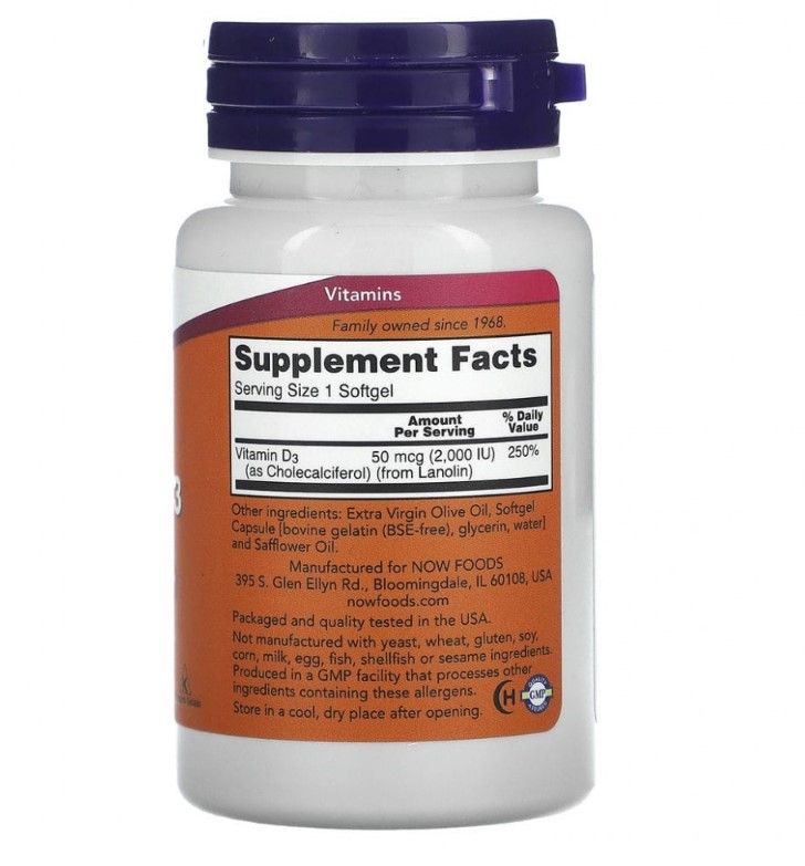 NOW Vitamin D3 - это высококачественная пищевая добавка, содержащая 50 мкг (2000 МЕ) витамина D3 в каждой софтгель-капсуле. Витамин D3 (холекальциферол) является важным питательным веществом, которое играет ключевую роль в поддержании общего здоровья организма. Каждая упаковка содержит 120 софтгель-капсул.