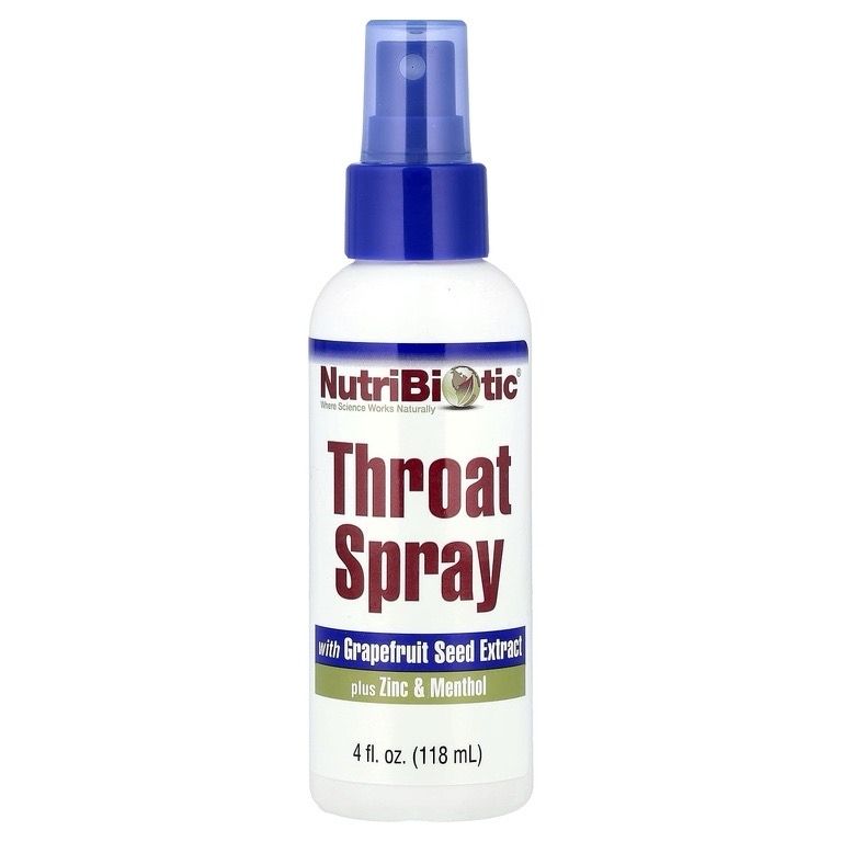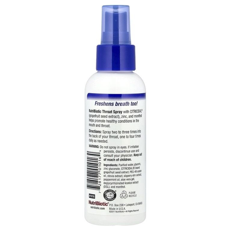 Спрей для горла NutriBiotic, содержащий Citricidal® (экстракт косточек грейпфрута), цинк и ментол, способствует здоровью горла и ротовой полости.
