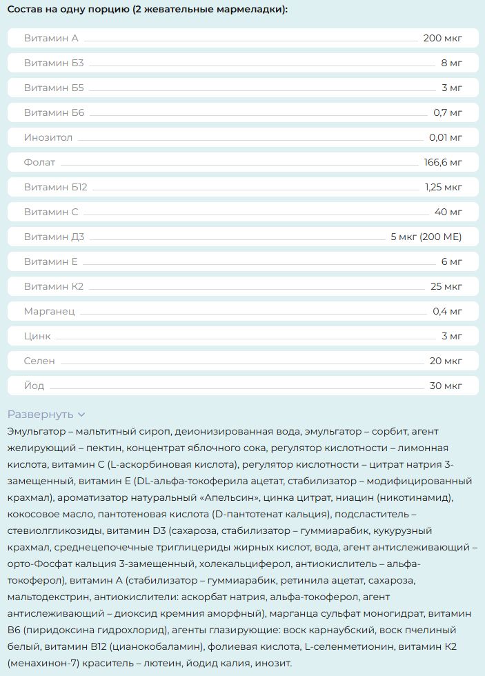 Орзакс Кидс Мульти - это вкусный и удобный способ для поддержки организма. Содержат 10 витаминов, 4 минерала и инозитол, необходимые для нормального роста и развития детей, среди них – витамины А, D, Е, С, К, группы В, цинк, селен, йод, марганец. Мармеладки имеют приятный апельсиновый вкус, что делает профилактику дефицитных состояний простой и удобной.