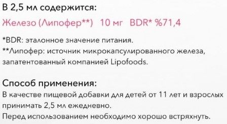 Производитель рекомендует принимать сироп 1 раз в день по 2,5 мл. Именно это количество содержит 10 мг железа — суточная доза с небольшим запасом, обеспечивающая поддержку нормального уровня железа в крови.
