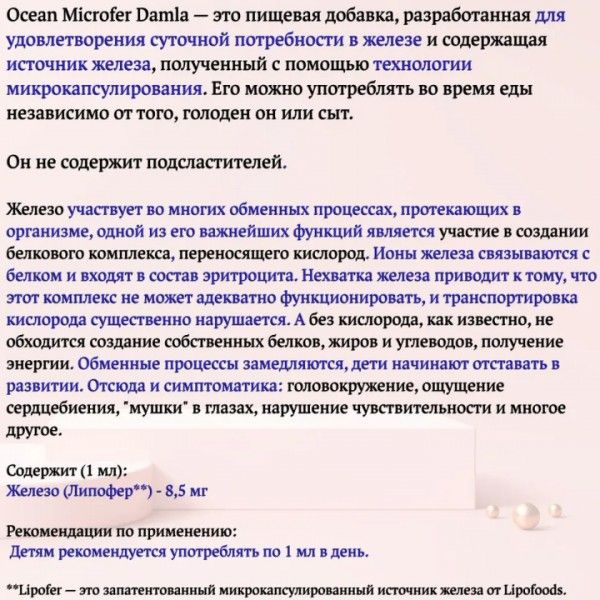 Препарат Ocean Microfer содержит железо, синтезированное с помощью технологии микрокапсулирования. Она имеет высокую усвояемость и проста в употреблении. Биодобавка выпускается в жидкой форме и принимается в виде капель. Суточная доза для детей старше 11 лет и взрослых составляет 1 мл препарата, в котором содержится 8,5 мг железа. Микроэлемент представлен в виде липофера — микрокапсульного источника железа. Он компенсирует дефицит железа и оказывает такое воздействие на организм: