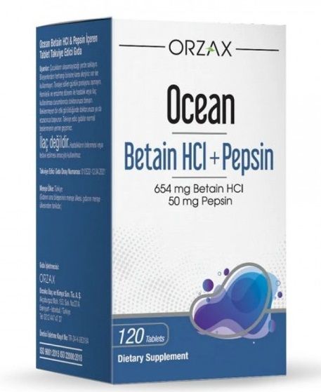 Пищевая добавка от турецкого бренда Ocean Betaine HCl + Pepsin содержит натуральные компоненты желудочного сока бетаин HCl и пепсин. Бетаин HCl – это вещество, обеспечивающее нормальную кислотность в желудочном просвете, а пепсин представляет собой фермент, участвующий в расщеплении белковых молекул на отдельные пептиды. Биологическая роль бетаина этим не ограничивается. Существуют данные о гепатопротекторных свойствах безводного бетаина, предотвращении при его приеме рака молочной железы, колоректального рака, болезни Альцгеймера. Все это связано с влиянием бетаина на снижение мутаций в молекуле ДНК.