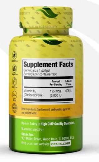 Мягкие капсулы Orzax с витамином D3 5000 МЕ представляют собой добавку с высокой дозой витамина D, которая оптимально усваивается организмом для повышения концентрации витамина D в крови. Эти мягкие капсулы легко глотать, каждая из них содержит 5000 МЕ натурального высококачественного ланолина, витамина D3. Витамин D3 5000 более эффективен для повышения и поддержания адекватного уровня витамина D в организме. Наша добавка с витамином D3 125 мкг не содержит ГМО, консервантов и подходит как мужчинам, так и женщинам.