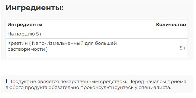 Креатин ( Nano-Измельченный для большей растворимости ) – 5 г