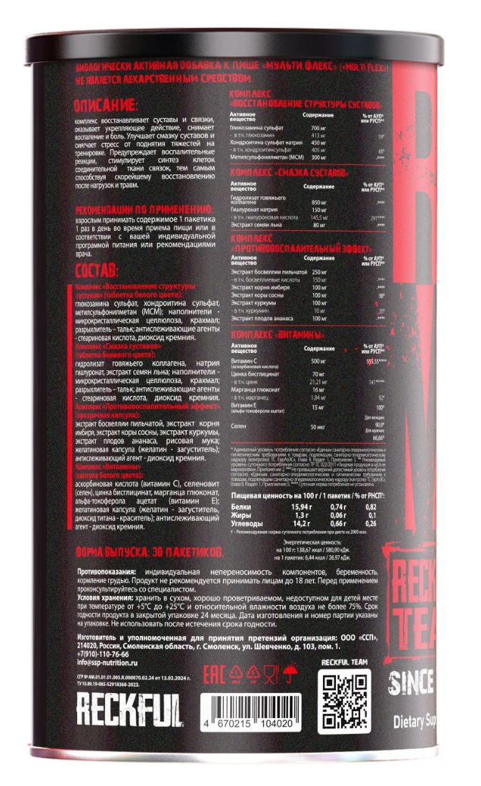 Рекфул монстр флекс – это продвинутый мультикомпонентный комплекс для защиты и восстановления суставов, связок и хрящей. Разработан для спортсменов и активных людей, испытывающих повышенные нагрузки. Формат 30 пакетов обеспечивает удобный и точный прием всех необходимых компонентов.
