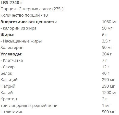 Каждая порция состоит из 40 граммов высококачественного белка и 203 граммов хорошоусвояемых углеводов.