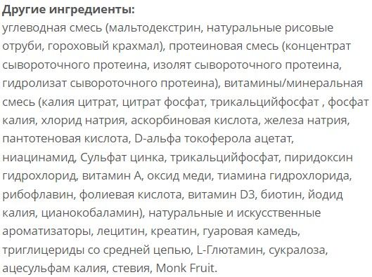 Состав продукта: мальтодекстрин, концентрат протеина молочной сыворотки, ароматизатор, изолятпротеина молочной сыворотки, гидролизат белка молочной сыворотки, крахмал гороха, рисовые отруби, креатин моногидрат,глютамин, триглицериды средней цепи, загуститель: (Е412), подсластители: (Е950), (Е955), антиокислитель: (Е322).