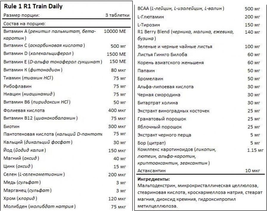 Компонентную матрицу комплекса составляют 24 витамина и минерала. Среди них есть витамины группы Б, которые задействованы во всех обменных процессах и в производстве энергии. Они требуются нашему организму для продуктивной работы нервной системы, вовлечены в процесс кроветворения, а также способствуют эффективной работе сердечно-сосудистой системы. Много в составе Mens Train Daily и витамина Д3. Данный витамин необходим нашему организму для эффективной иммунной функции, для укрепления структуры костной и зубной ткани. Витамин Д нередко используют для уменьшения симптомов стресса. Дополнена витаминная формула витаминами А, С и Е. Это витамины с сильными антиоксидантными свойствами. Они помогают организму бороться с оксидативным стрессом и тем самым защищают его от развития многих заболеваний.