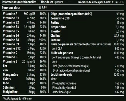 2 мультивитаминные капсулы: карбонат кальция, DL-альфа-токоферил ацетат, аскорбиновая кислота, магния оксид, пиридоксина HCl, кальция D-пантотенат, тиамина мононитрат, рибофлавин, никотинамид, железа фумарат, рутин, цинка сульфата моногидрат, холин битартрат, витамина A ацетат, D-биотин, магния стеарат, марганца сульфат моногидрат, селенит натрия, гесперидин, инозитол, цианокобаламин, меди II сульфат пентагидрат, холекальциферол, фолиевая кислота, йодид калия, натрия молибдата дигидрат, желатин.