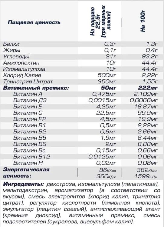 Состав: Декстроза, изомальтулоза, мальтодекстрин, ароматизатор (в соответствии со вкусом), смесь электролитов (хлорид калия, тринатрия цитрат), лимонная кислота, эмульгатор (лецитин соевый), кремния диоксид, витаминный премикс,сукралоза, ацесульфам калия.