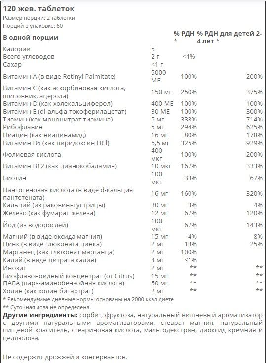 Витаминно-минеральный комплекс в виде жевательных таблеток с вишневым вкусом обеспечит вашего ребенка всеми нужными витаминами и минералами в дозах, соответствующих возрасту и потребностям растущего организма.