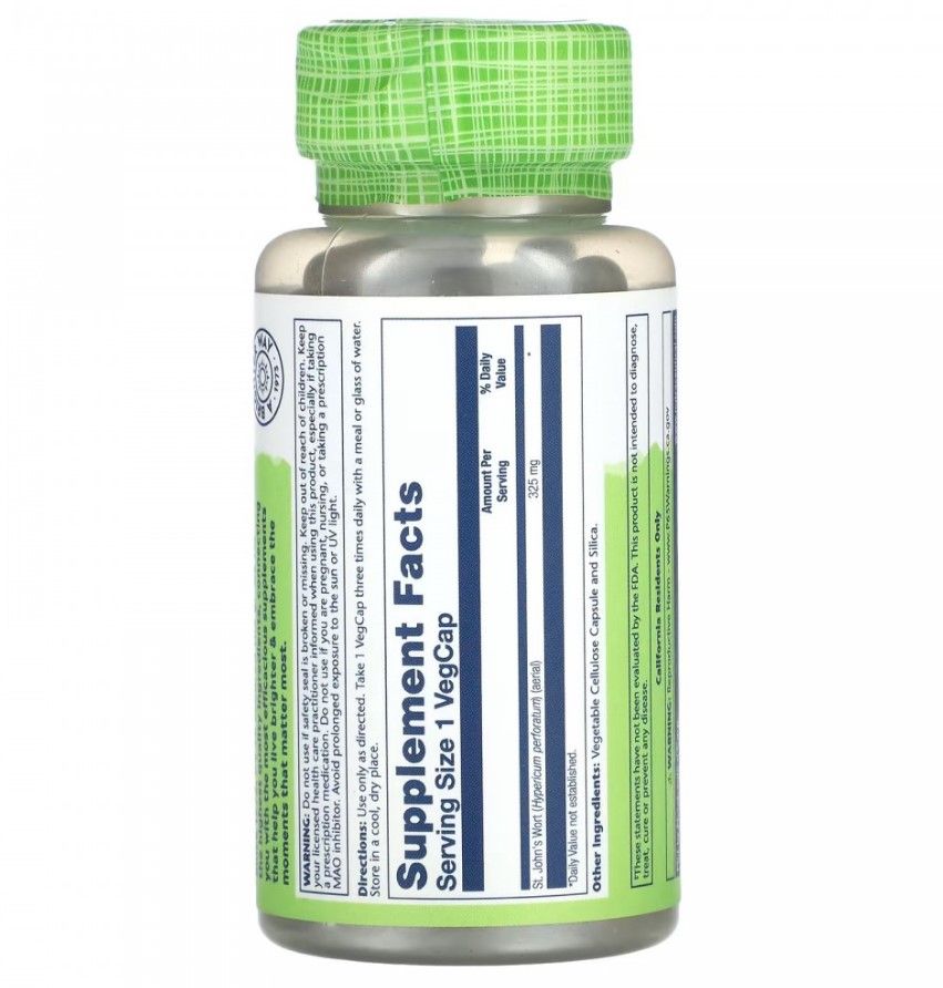 St. John's Wort от Solaray – это высококачественный стандартизованный экстракт зверобоя. Добавка оказывает комплексное влияние на организм, имеет протекторные и общеоздоровительные свойства. Зверобой улучшает умственную активность, нормализует когнитивные функции и память. Также растительный экстракт помогает улучшить работу ЦНС, защитить нервные ткани и снизить риски возникновения многих заболеваний и расстройств психики. Также зверобой полезен для повышения релаксации, улучшения засыпания и глубины сна.