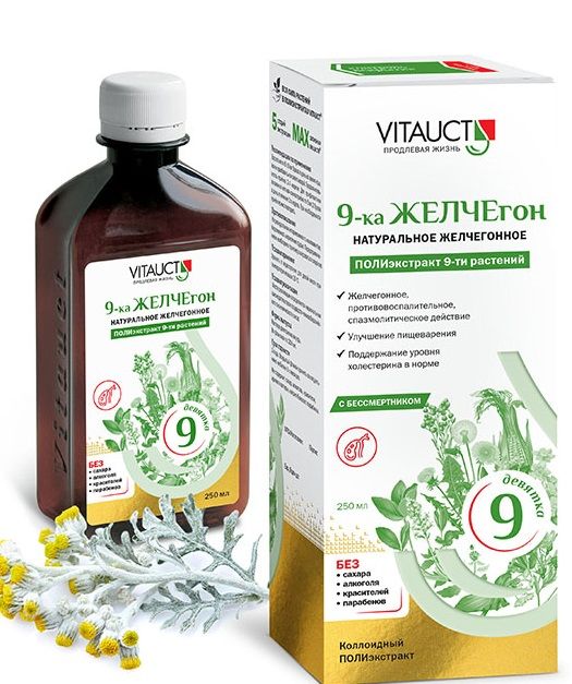Vitauct 9-ка ЖЕЛЧЕгон 250 мл - это эффективное и безопасное средство для поддержания здоровья желчевыводящей системы и печени, которое способствует улучшению пищеварения и общего самочувствия.