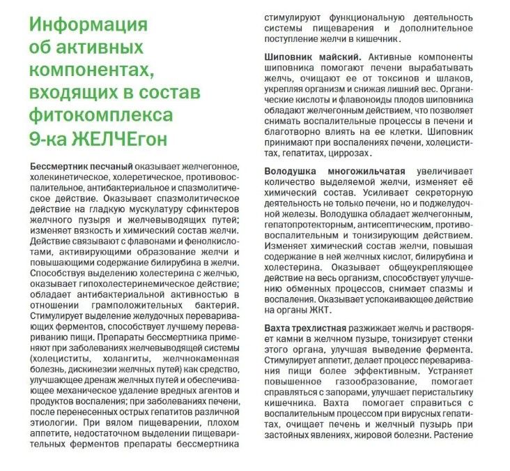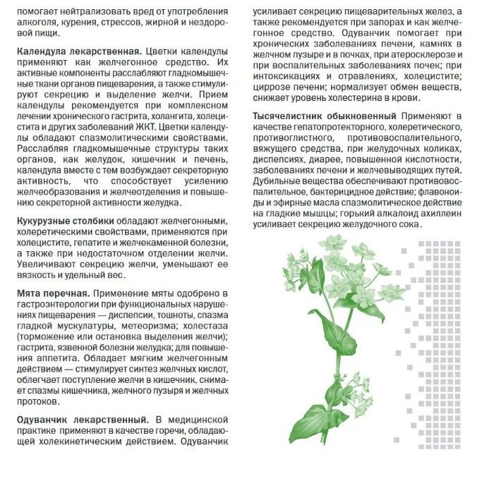Натуральные ингредиенты: Продукт содержит натуральные растительные экстракты и компоненты, такие как расторопша, мята перечная, тысячелистник, шалфей и др., которые известны своими желчегонными и противовоспалительными свойствами.