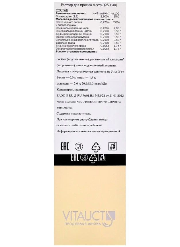 Густоватая жидкость от коричневого до красновато-коричневого цвета с характерным запахом; допустимо наличие опалесценции, помутнение или выпадение осадка, что не влияет на качество и действие данного фито-комплекса.
