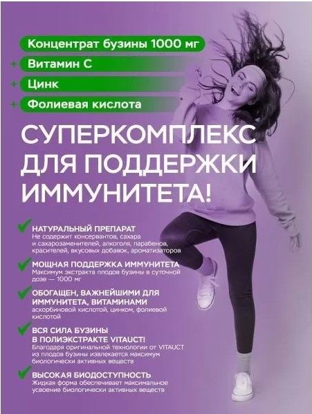 Высокая эффективность: Благодаря своему уникальному составу, обеспечивает высокую эффективность в поддержании и укреплении иммунитета. Экстракт бузины обладает противовоспалительными и антиоксидантными свойствами, способствуя борьбе с инфекциями и укреплению организма.