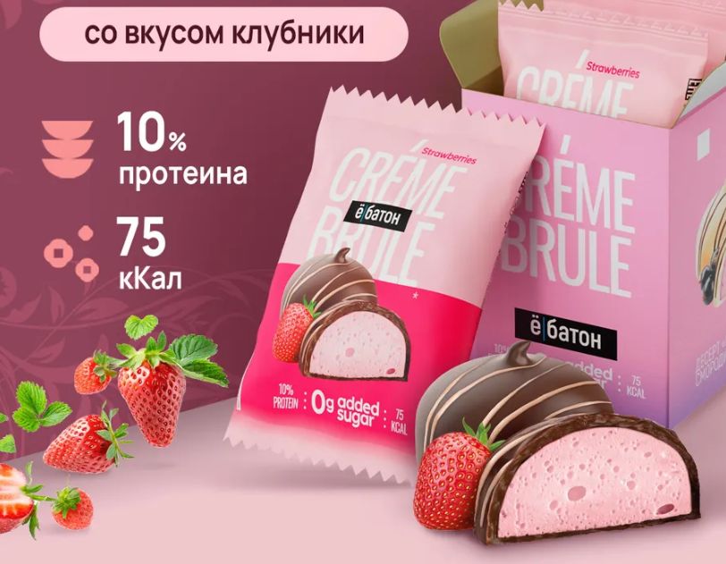 Crème Brule Ё/батон – нежнейший протеиновый десерт с хрустящей глазурью, нежным клубничным вкусом и легким ванильным послевкусием. Это полезный пп перекус без сахара, который вы можете себе позволить в любое время.