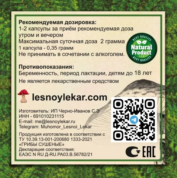 Мухомор красный в капсулах - природный антидепрессант, улучшает память, концентрацию , усиливает мозговую активность. При приеме поднимается продуктивность любой деятельности. Устраняет нервозность и стрессовое состояние. Повышает выносливость и способность к восстановлению после физических нагрузок. На фоне устранения стресса улучшается продолжительность и качество сна.
